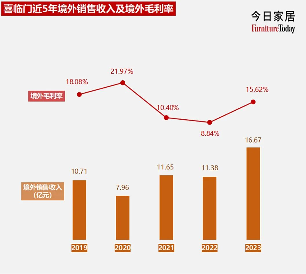 2019~2023年喜临门境外收入年复合增长率为11.7%,毛利率水平较低,2023年仅为15.62%,但较2022年提升6.78个pct。