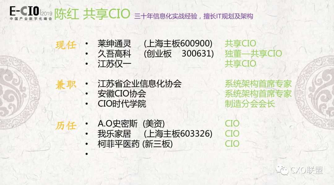 共享CIO名字好听一点,实际上是IT顾问,我现在专职做IT顾问,已经快半年了,目前三家企业,两家是上市企业,都在南京本地,还有一家也在江苏,江苏仅一,一家装备制造公司。另外在江苏省信息化协会和安徽CIO协会都是系统架构首席专家,帮他们做一些事。数字化转型网www.szhzxw.cn