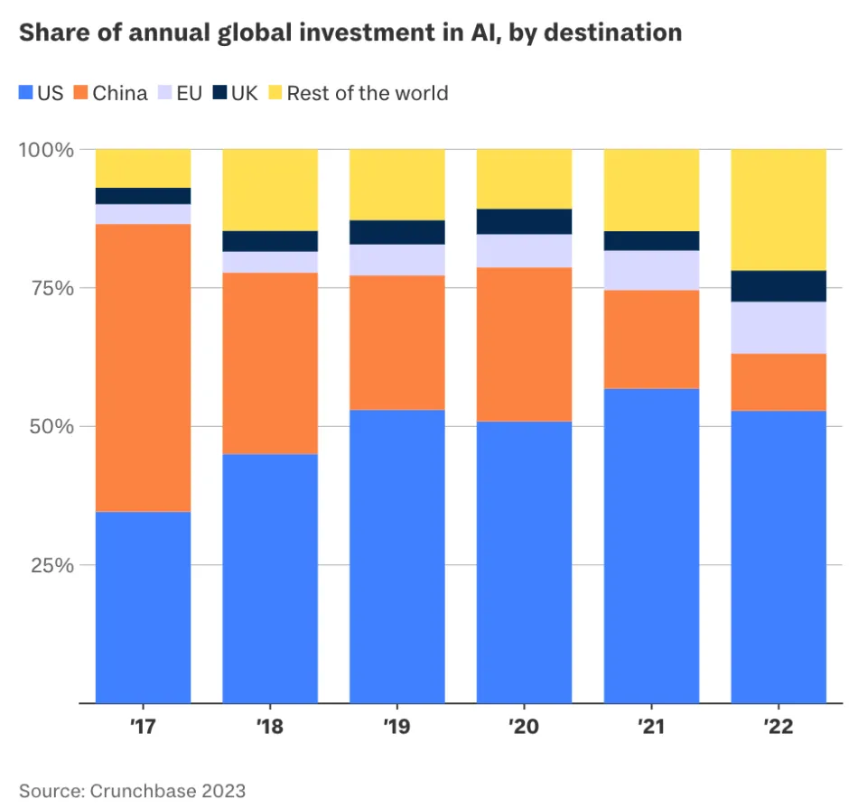 在投资方面,美国与中国的差距被进一步拉大。全球私营投资对美国人工智能初创企业的份额,从2020年的51%(225 亿美元)增至2022年的 53%(270 亿美元),而中国的份额则从29%(123 亿美元)大幅下降至仅 10%(53 亿美元)。
