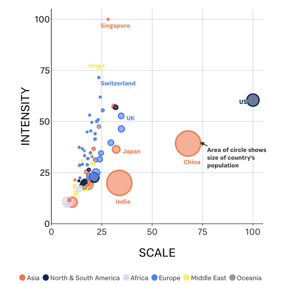 在人工智能强度维度中,新加坡、以色列和瑞士处于领先地位,这意味着这些国家在考虑相对于其人口和经济规模的人工智能能力时,表现最佳。