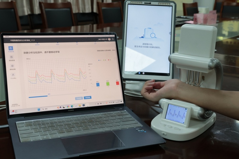 将手臂平放在设备凹槽中,手心向上,“中医”的“三指”慢慢移过来按住寸口脉,力道由轻到重根据脉象不断调整,不到两分钟,更换一侧手臂继续“把脉”,再配合“查看”舌像、“问诊”,很快,一份详细的“诊断报告”和生活建议就出现在眼前。这些检查,并非如想象中出自一位德高望重的中医大家,而是由桌上这台小小的智能脉诊仪和平板电脑般大小的智能舌面诊仪,加上部署在云端的智能辅助诊疗系统完成的。