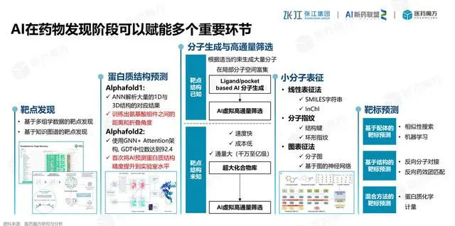 首先可以看到在靶点发现上,可以通过多组学数据和知识图谱等多个因素挖掘出靶点的研究价值。其次就是子啊蛋白质的结构预测具有显著优于人类的局限,通过对氨基酸组件的距离和折叠角度来预测来精准研究蛋白质结构,并且通过使用GNN+Attention架构从而可以使AI预测蛋白质结构的精准度提升到实验室水平,从而可以减少资源损耗,更多的只需要进行结构验证就能够完成蛋白质的结构解析。