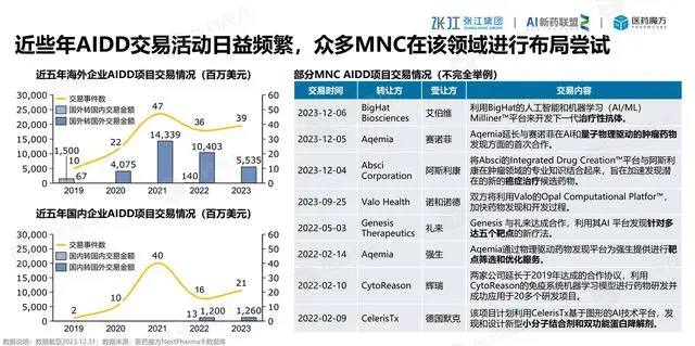 随着新冠疫情的爆发,国外AIDD交易的次数从2019年的10例上升到2021年的47例,并且在2023年维持在39例上,从金额上看,从2019年的0.67亿美元上升到2023年年的55亿美元。国内从2019年的两例上升大2023年的21例,金额在2023年上升到12.6亿人民币。总体趋势是随着行业渗透加深,从而为AI在医药行业扩张新的需求。 数字化转型网www.szhzxw.cn