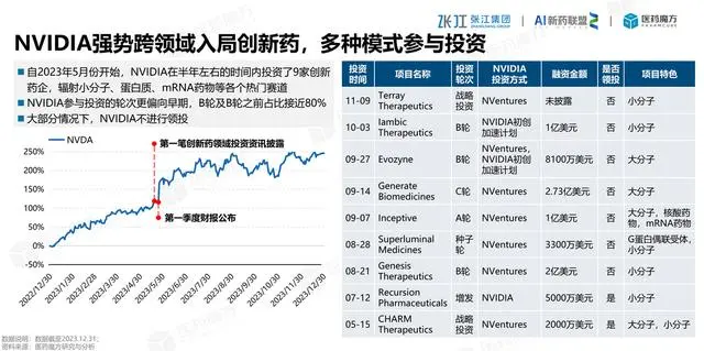 英伟达陆续在2023年陆续投资了9家AI制药企业。陆续投资了8.57亿美元,还不包括2023年投资的Terray Therapeutics公司的的投资资金。从投资的公司项目来看,一般是小分子,一半是大分子。