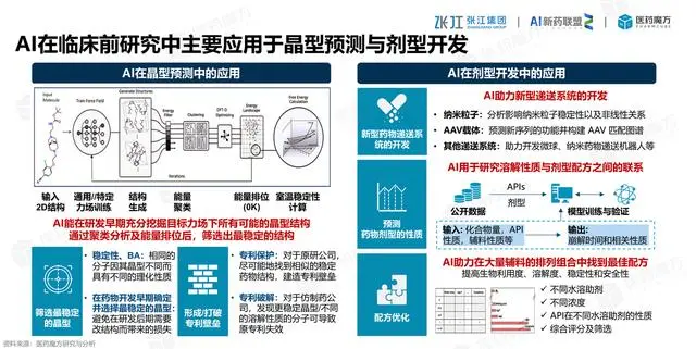 当前AI在临床前研究中主要是用于晶型预测和剂型开发。通过对相同分子中晶型不同从而具有的不同理化性质预测分子结构的稳定性和生物活性的延续性。从而可以让研发者寻找更稳定的分子晶型用于后续研究的当中。从而减少实验室的重复尝试的时间成本。也能够为专利覆盖稳定晶型做好布局。另外AI在辅料中应用也是非常必要和重要,辅料千千万,不仅有种类的变化,还有配比的变化,通过AI 可以做延伸统计分析,从而发现更加优秀的组合配方。