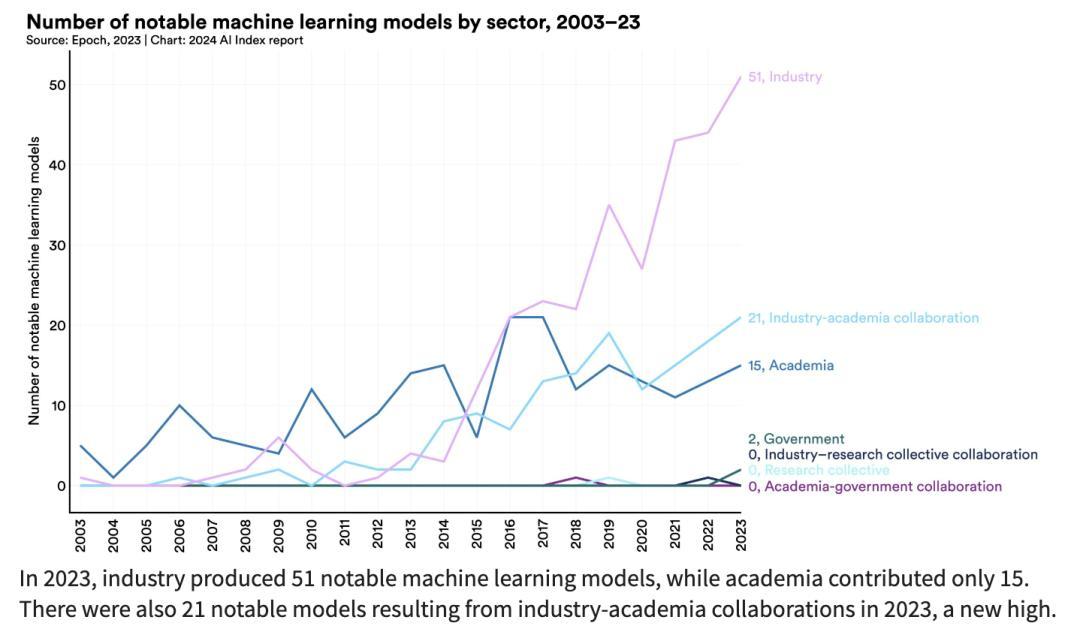 2023 年,产业界产生了 51 个著名的机器学习模型,而学术界只贡献了 15 个。2023 年,产学合作还产生了 21 个著名模型,创下新高。此外,108 个新发布的基础模型来自工业界,28 个来自学术界。
