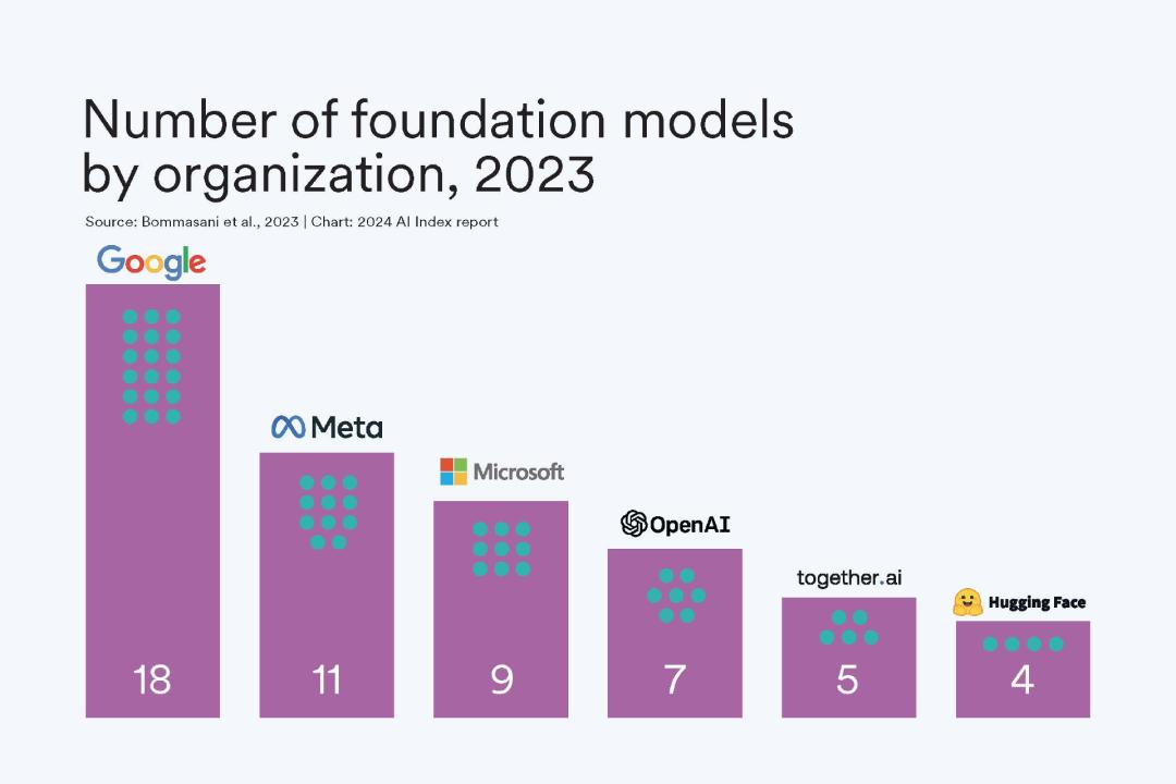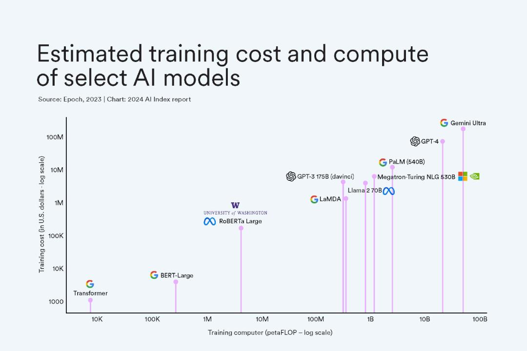 根据 AI Index 的估算,最先进的人工智能模型的训练成本已经达到了前所未有的水平。例如,OpenAI 的 GPT-4 估计使用了价值 7800 万美元的计算资源进行训练,而谷歌的 Gemini Ultra 的计算成本则高达 1.91 亿美元。