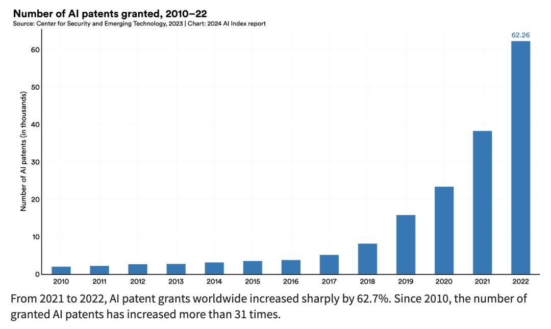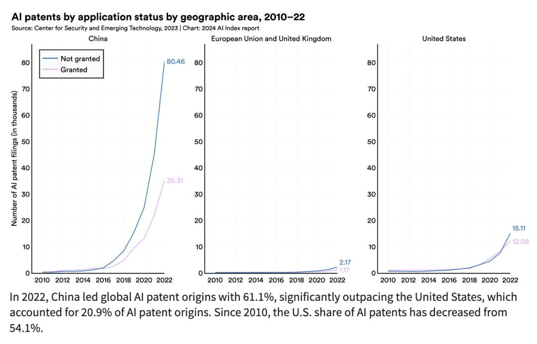 然而,中国依然是美国最大的竞争对手,中国的机器人安装量居世界首位;同样,世界上大多数人工智能专利(61%)都来自中国。