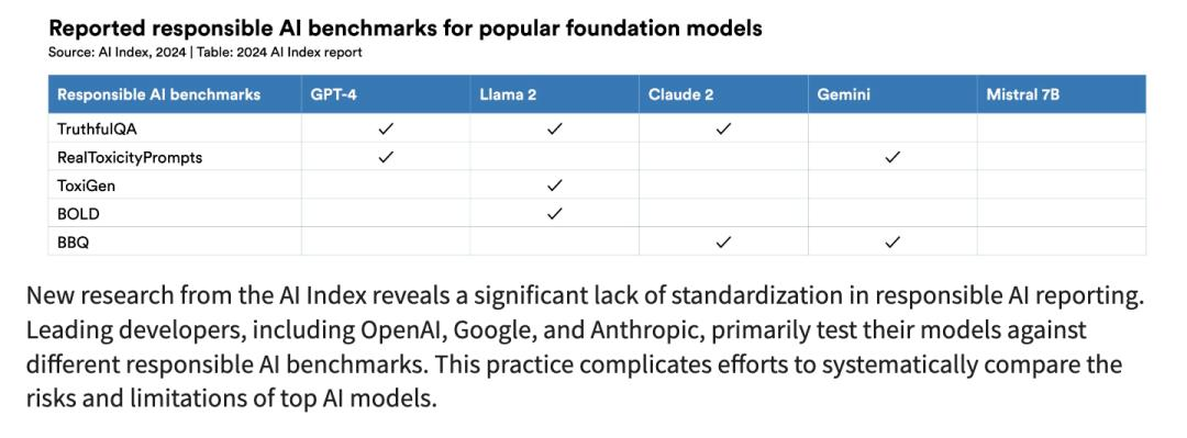 AI Index 的最新研究显示,负责任的人工智能严重缺乏标准化。包括 OpenAI、谷歌和 Anthropic 在内的领先开发商主要根据不同的负责任人工智能基准测试他们的模型。这种做法使系统地比较顶级人工智能模型的风险和局限性的工作变得更加复杂。