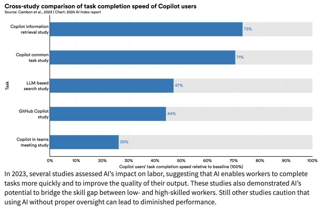 2023 年,多项研究评估了人工智能对劳动力的影响,表明人工智能可以让打工人更快地完成任务,并提高他们的产出质量。这些研究还表明,人工智能有可能缩小低技能和高技能工人之间的技能差距。还有一些研究警告说,在没有适当监督的情况下使用人工智能可能会起到负面作用。