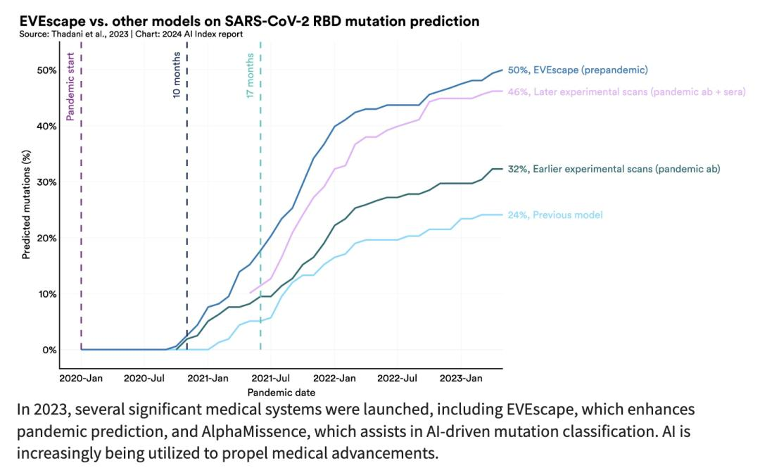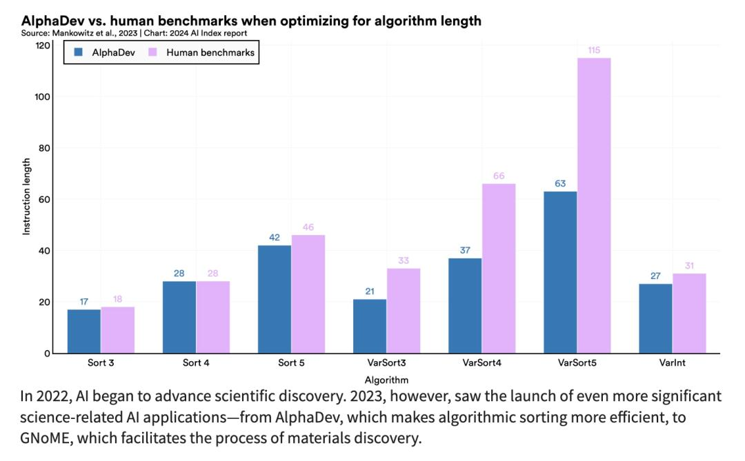 2022 年,人工智能开始推动科学发现。然而,2023 年,与科学相关的更重要的人工智能应用启动——使算法排序更高效的 AlphaDev、促进材料发现过程的 GNoME、可在一分钟内提供极其准确的 10 天天气预报的 GraphCast、成功对 7100 万种可能的错义突变中的约 89% 进行分类的 AlphaMissence。