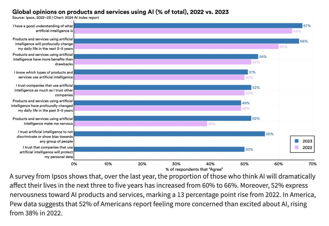 来自市场研究公司 Ipsos 的一项调查显示,在过去一年中,认为人工智能将在未来 3-5 年内极大地影响他们生活的人,比例从 60%上升到 66%。此外,52% 的人对人工智能产品和服务表示焦虑,比 2022 年上升了 13 个百分点。