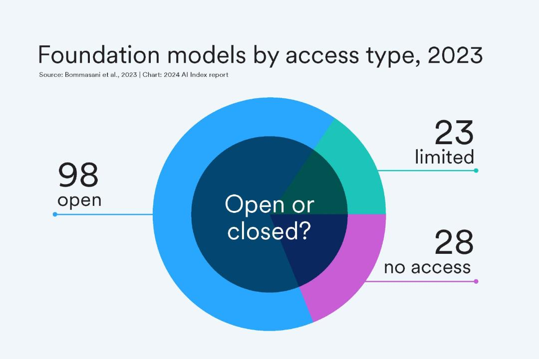 在技术方面,今年的 AI Index 报告称,2023 年全球发布的新大型语言模型数量比上一年翻了一番。三分之二的模型是开源的,但性能最高的模型来自拥有封闭系统的行业参与者。