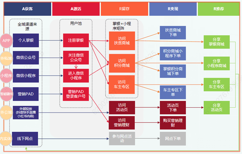 用户行为数据采集分析平台定制营销主题集市,为业务营销活动提供定制化用户流转地图实时分析模型(如图8所示),通过可视化关键节点流转情况,基于页面打开率、立即购买率、交易成功率、活动分析率等度量指标,建立以业务为导向、用户全生命周期、可逐层拆解的基于全域化、平台化、精细化实现营销场景内外循环和数据指标体系,以提高行内各渠道MAU作为战略目标,为业务方提供高可信价值的数据参考以及有针对性的优化引流活动方案。数字化转型网www.szhzxw.cn