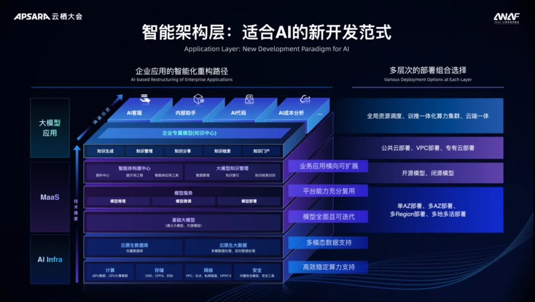 当面对新的 AI 挑战时,出现了一个新的概念:AI 原生架构。当我们去构建新的 AI 应用或者 AI 智能体时,需要包括高性能的网络、存储等弹性基础设施,底层的基础大模型能力,弹性的 API 能力,以及模型服务工具能力、微调工具、向量数据库等新的能力,这才是一个 AI 原生应用应有框架。