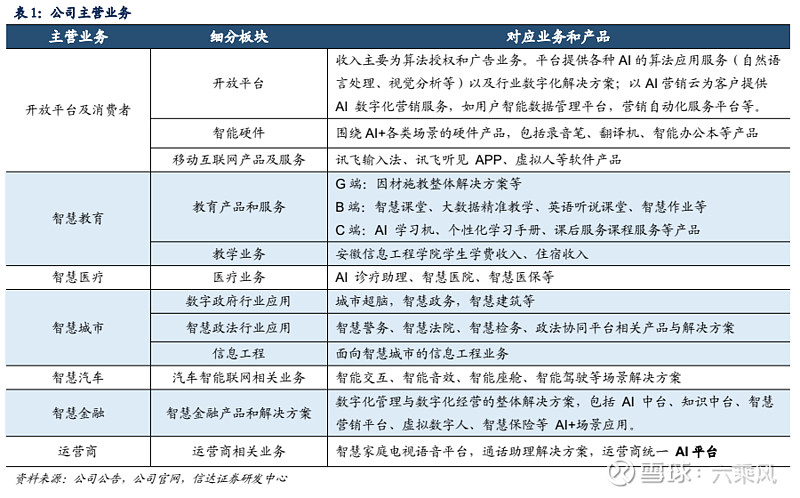 公司 以核心 AI 技术作为开放平台的底层支座,坚持“平台+赛道” 的战略, 开发平台赋能开发者, 构建持续闭环迭代的生态体系,共建商业共赢和健康繁荣的开放生态, 并将成熟应用 逐步落地到智慧教育、 智慧城市、 智慧汽车、 智慧医疗、 运营商、 智慧金融以及消费者等领域。 下表为公司各部分业务的细分口 径以及对应的产品和服务。 数字化转型网www.szhzxw.cn
