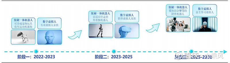 2022 年,公司发布了“讯飞超脑 2030 计划”,并设置了三个阶段性的里程碑,以此为牵引来推动源头技术的系统性创新,突破面向复杂场景的多模感知、多维表达,认知智能和 AI 运动智能算法,突破软硬一体机器人的关键软硬件技术。此外,公司在多项核心技术上不断实现突破,其积累的技术有望使其在大模型的研发中处于前列。“讯飞超脑 2030 计划”划分为三个阶段性里程碑:第一阶段(2022-2023),公司将推出可养成的宠物玩具、仿生运动机器狗等软硬件一体的机器人,同期推出专业数字虚拟人家族,担当老师、医生等角色;第二阶段(2023-2025),公司将推出自适应行走的外骨骼机器人和陪伴数字虚拟人家族,老人通过外骨骼机器人能够实现正常行走和运动,同期推出面向青少年的抑郁症筛查平台;第三阶段(2025-2030),最终推出懂知识、会学习的陪伴机器人和自主学习虚拟人家族,全面进入家庭。