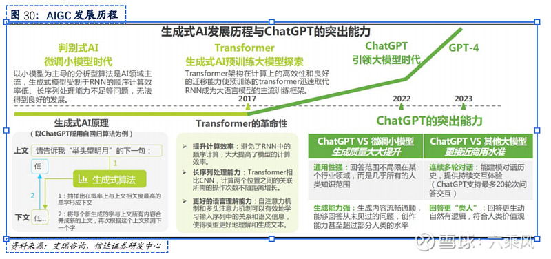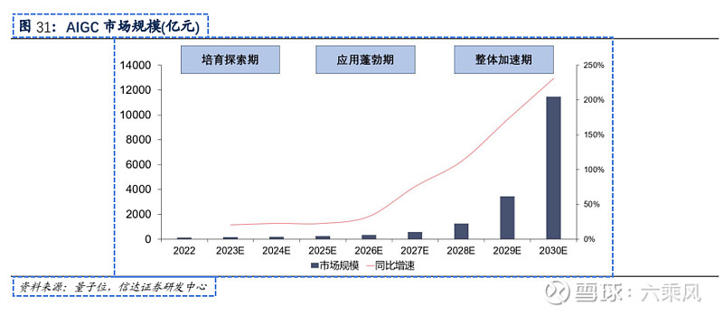 量子位智库表示我国 AIGC 的发展可分为三个阶段, 培育探索期、 应用 蓬勃期、 整体加速期, 我国 2023 年 AIGC 市场规模预计可达到 170 亿人民币。 2023-2025 年是我国AIGC 产业市场规模增长的第一阶段, 增长率维持在 25% 左右; 2025 年市场规模达到约260 亿人民币, 进入应用蓬勃期; 2028 年进入第三阶段, 应用层蓬勃将带动产业快速增长,AIGC 产业将延展出完整产业链并在商业化场景上持续拓宽拓深, 年复合增长率将超过 70%,量子位智库预计 2030 年市场规模超万亿。