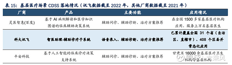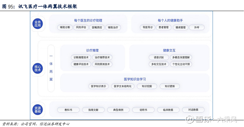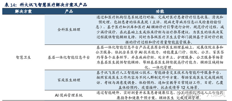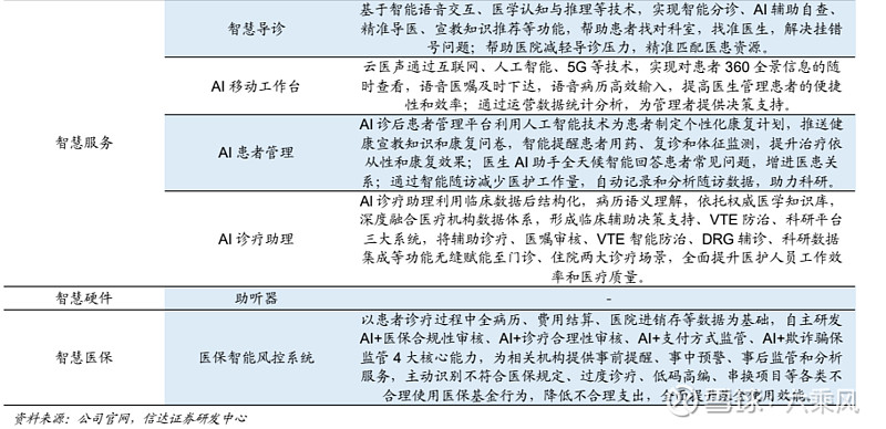 公司相关产品及解决方案覆盖五大智慧医疗领域,包括智慧卫生、智慧医院、智能硬件、智慧医保、智慧影联五大领域,代表产品有智医助理、医保智能风控系统、AI 慢病管理系统等。公司智慧医疗业务核心优势在于其提出的医疗 AI“一体两翼”技术框架体系,该体系
