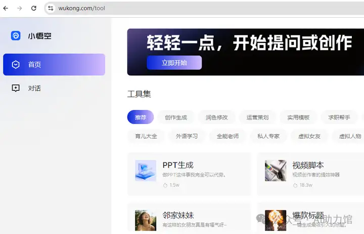 二、小悟空:多场景AI工具集合,创作生成、专业咨询、虚拟角色对话等