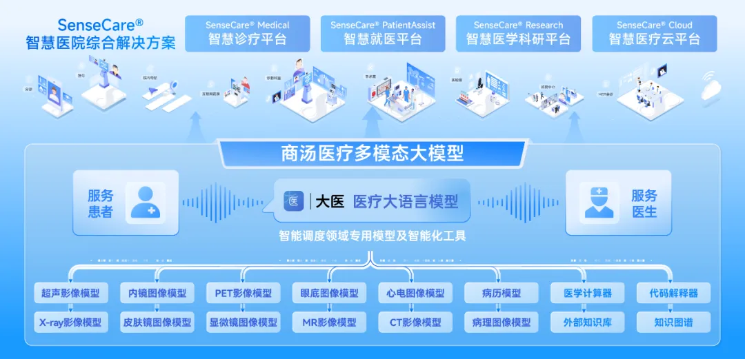 事实上,去年商汤科技就已落地了大医场景应用。通过内置的“场景集市”模块,大医提供13个预设医疗场景的应用,包括智能自诊、用药咨询、诊后随访管理、智慧病历、影像报告结构化等,覆盖了智慧大健康、智慧患者服务、智慧临床以及数智建设四大领域。