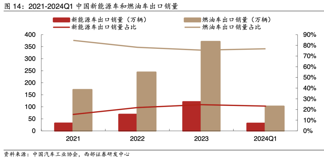 2023年,我国新能源车和燃油车出口销量分别为120.3/370.7万辆,新能源车销量从2021年的仅31万辆增长了接近3倍,占比也从2021年的15%提升至2023年的25%。