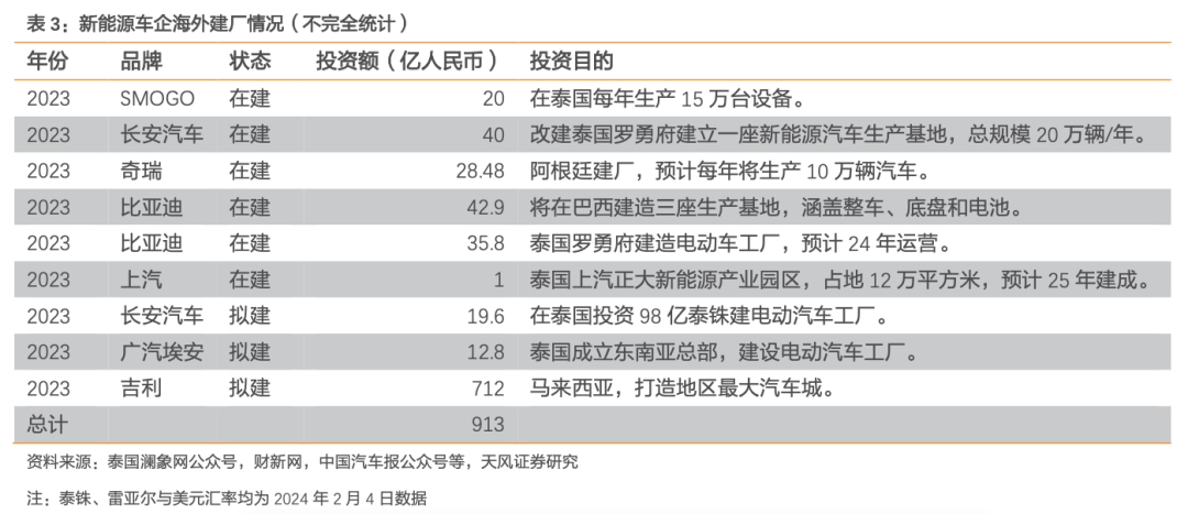 - 海外新能源车销售带来的高利润驱动整车厂出海布局,头部企业海外投资超913亿元,集中于东南亚以及南美等地;