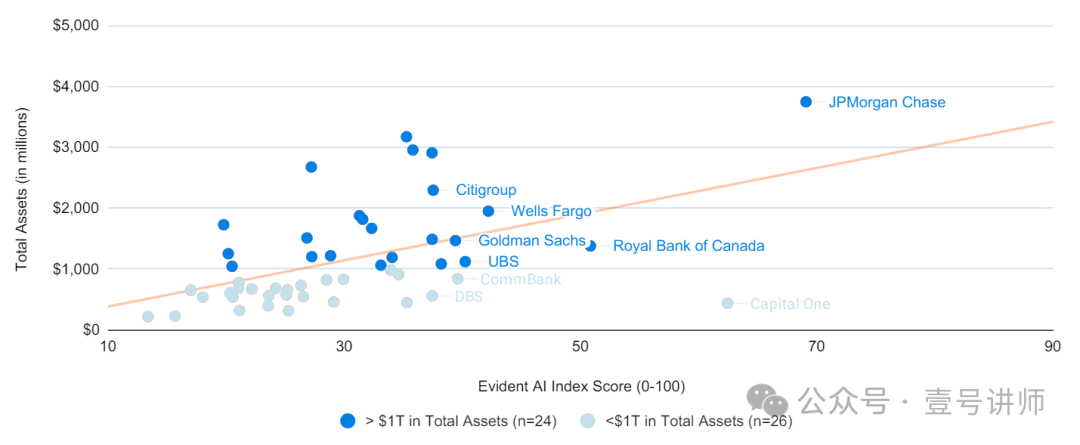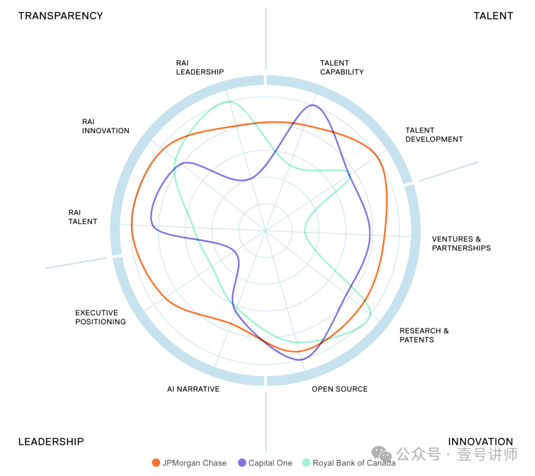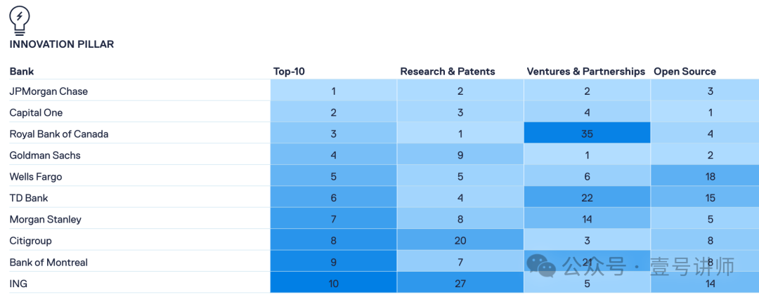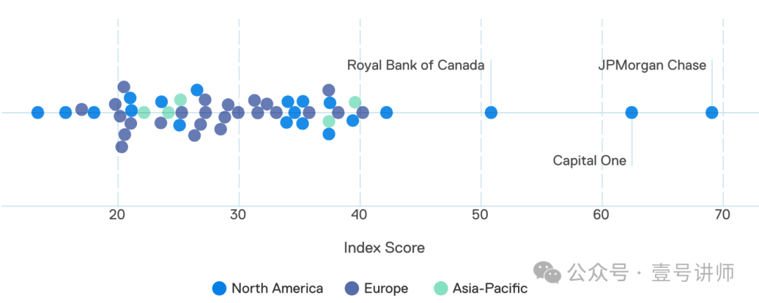 “Evident AI Index”人工智能指数评估了企业在人工智能准备方面采取的各种方法,首先是银行。2023年11月的指数涵盖了北美、欧洲和亚洲50家最大的银行。每家银行都根据100多个独立指标进行评估,这些指标来自数百万个公开数据点,具体涉及四大支柱:人才、创新、领导力和透明度。