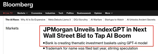 5月4日,彭博消息,全球最大金融机构之一摩根大通正式发布了IndexGPT,可自动创建“主题投资篮子”策略。