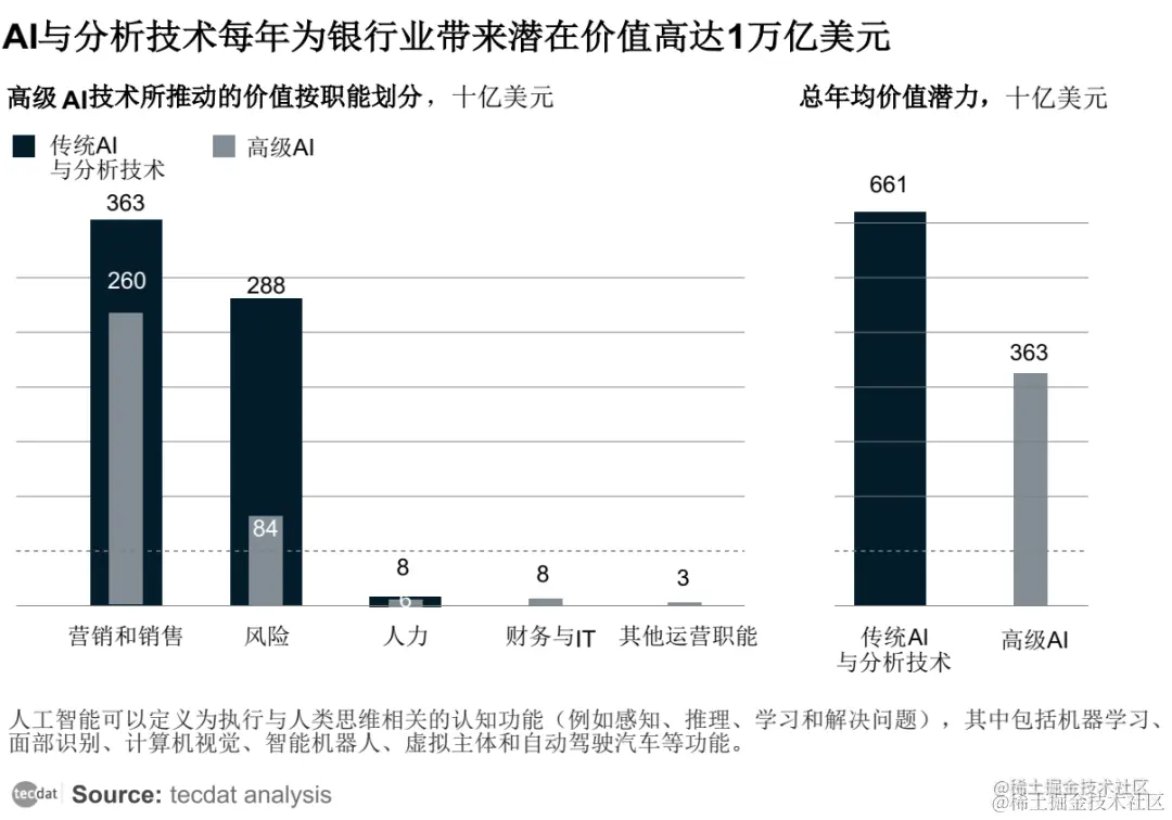 毫无疑问,我们已经进入了一个以 AI为主导的数字时代,随着数据的存储与处理费用的降低,人们对信息的获得与连接的普遍提高,人工智能技术得到了快速的发展。人工智能技术可以在有效控制风险的同时,提高人工决策的效率和精度。根据麦肯锡分析,人工智能技术在所有行业中都具有不可比拟的潜在价值,比如AI技术,它可以为银行创造一年1万亿美元的增值价值。