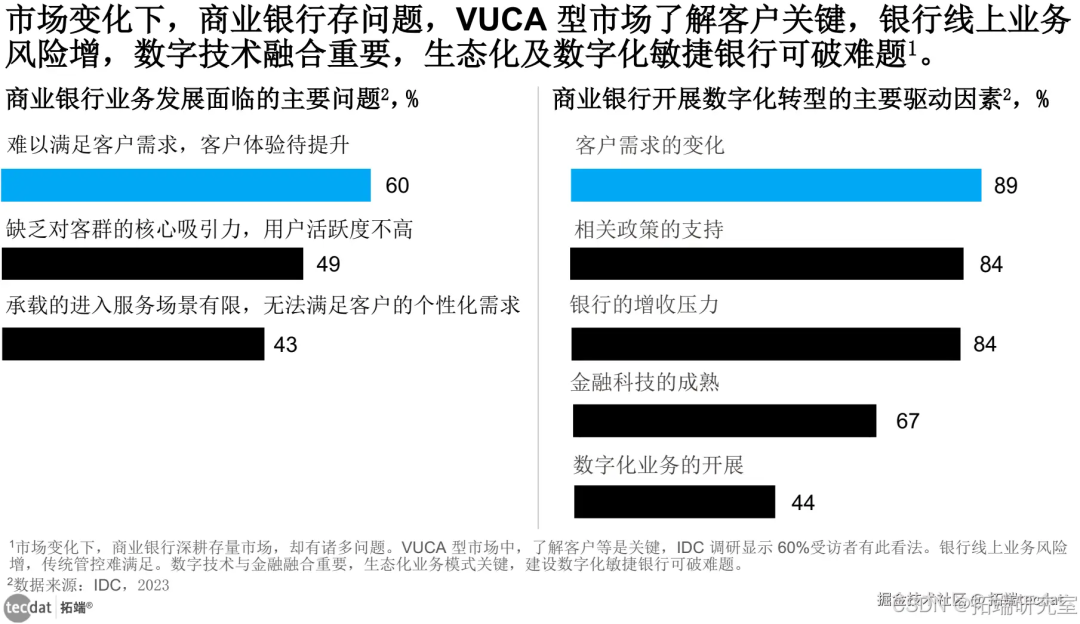 随着市场环境的持续变迁以及客户行为的不断转变,客户服务与业务发展层面的难题日益凸显。在这种形势下,深耕存量市场已然成为众多商业银行的核心发展策略。然而,当前商业银行普遍存在市场敏锐度欠佳、流程繁琐、金融资源投入与产出失衡等现象,进而引发金融服务产品供给不均、创新效率低下等问题。与此同时,在竞争激烈的市场中,由于缺乏精细且灵活的营销运营策略与工具,商业银行面临老用户流失率高、新客转化难等困境。如何在充满不确定性的 VUCA 型市场中,更加全面且精准地洞察客户,在服务过程中赢得客户认可、优化客户体验并增强客户忠诚度,已成为当下亟待解决的关键问题之一。IDC 调研数据表明,60%的受访者指出,难以满足客户需求以及客户体验有待提升乃是当前业务发展面临的主要难题。