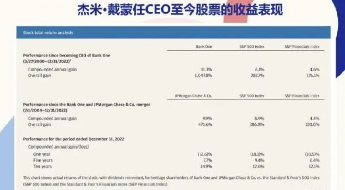 2022年摩根大通发布的财报显示,摩根大通与第一银行合并以来(2004/7/1-2022/12/31)摩根大通股票复合年收益达到9.9%,相比于其他银行,按标普金融指数的4.4%算,可谓是遥遥领先。并且2022年给他的股东们带来了18% 的有形股本回报率 (ROTCE)。