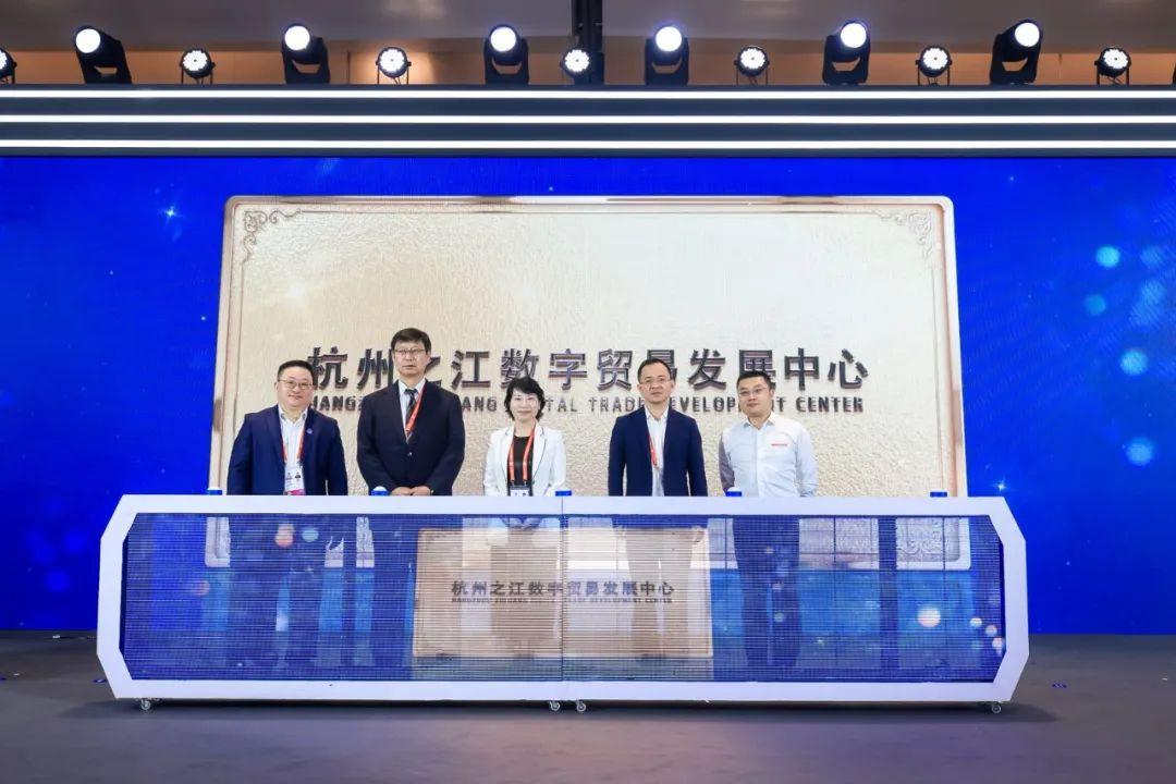 在成果发布和签约环节,杭州之江数字贸易发展中心(以下简称“中心”)成立,杭州市商务局党组成员、副局长陈卫菁、杭州市滨江区 区委常委、副区长高翀、杭州服务贸易投资促进会会长钟明博、新华三集团数字中国研究院执行副院长岳鹏和浙江中南卡通股份有限公司总经理沈玉良为中心揭牌。会上中心与象马跨境供应链服务(亚洲)公司签订了服务企业“走出去”战略合作协议;泛嘉科技携4家数字贸易企业首发“企业服务智能体”;此外,《2024年杭州数字服务贸易重点企业》《2024杭州数字贸易综合指数》等内容在会上成功发布。