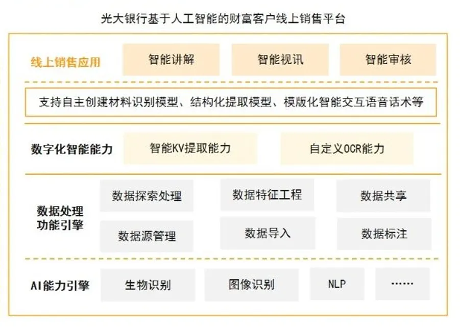 光大银行为实现“打造一流财富管理银行”的战略愿景,逐年加大科技投入进行数字化转型,已在财富管理业务的多个领域实现了业务突破。其中,基于人工智能的财富客户线上销售平台集中实现了线上理财产品智能AI交互过程中的“听说读写”能力,减少人力资源投入并提升审核效率,同时能够确保审核标准统一、产品信息充分披露,提升财富管理业务关键节点的智能化水平。