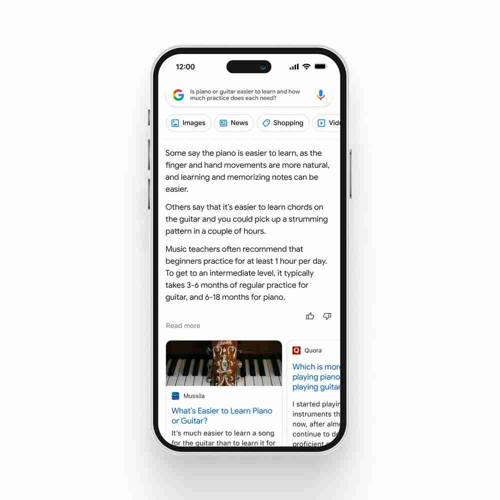 In these times, AI can help, synthesizing insights into questions for which there is no one right answer. Soon, you’ll see AI-powered features in search that dissect complex information and multiple perspectives into an easy-to-digest format so you can quickly see the big picture and learn more from the web — whether it’s looking for additional perspectives. Such as blogs by people who play both piano and guitar, or digging into related topics. Such as steps to get started as a beginner. These new AI features will soon begin rolling out on Google search.