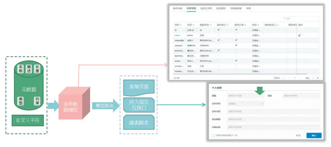 数据模型可视化开发提供表格化的数据模型设计能力,通过数据模型驱动引擎识别元数据和自定义字段,自动生成建表脚本,并同步生成表单页面及持久层交互接口。其中,元数据基于业务标准、技术规范设计,能够动态满足客户需求变化,通过数据模型驱动动态建模,实现对业务数据的快速处理功能。如图4所示。