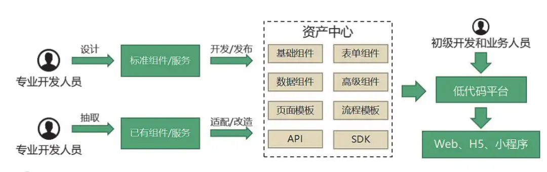 存量技术资产纳入低代码开发平台后,实现了应用开发资产互通互联,可以有效盘活存量资产;同时角色划分更为清晰,对于技术能力较强的专业开发人员,可以聚焦于平台基础组件开发,通过不断持续交付新的组件,实现平台整体能力提升,对于业务流程熟悉的开发人员,低代码能有效屏蔽底层技术细节,让开发人员聚焦于业务实现。如图3所示。