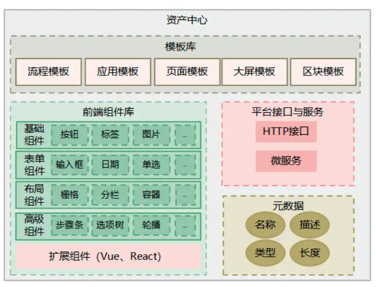 资产接入主要划分为组件、模板及外部接口。通过提供资产扩展脚手架,在其中添加组件、区块的结构化定义,实现可视化组件纳入。基于原子化组件在平台内进行编排搭建的页面、流程及应用可导出为模板,供后续开发复用。通过平台内置的接口中心,可以导入外部接口实现能力复用。如图2所示。