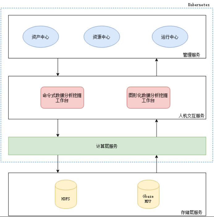 AI平台在农业银行IT基础架构中属于中后台版块,主要面向数据分析师提供数据探索、模型建模、模型生产部署等支持,具备完善的MLOps支撑能力。AI平台目前分为管理服务、人机交互服务、数据存储与计算服务三个部分,其中管理服务与人机交互服务已基于Kubernetes实现上云,而数据存储与计算依赖Gbase MPP与Hadoop集群属于云下部署。目前平台存在数据运维复杂度高,资源扩容不够灵活的问题,同时Gbase MPP与Hadoop对多租户资源隔离与生产运维支持也不够灵活。