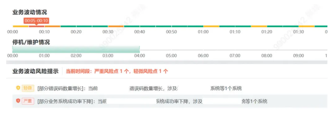 业务波动智能检测:通过对交易码、错误码、渠道、通道等维度的聚合分析生成相关维度的交易量、成功率、响应时间、错误数等业务指标,基于滑动平均、ESD、LightGBM等算法,综合节假日、工作日、业务高峰等时间因素及不同业务指标特性动态生成指标基线,无需人工配置阈值即可智能识别指标异常。在此基础上综合指标异常情况持续时间、偏离度等因素判断指标异常态势,如业务量显著下降、响应时间突增后保持、错误码首次出现、错误码数量持续上升,在识别到异常波动后及时产生预警提示。