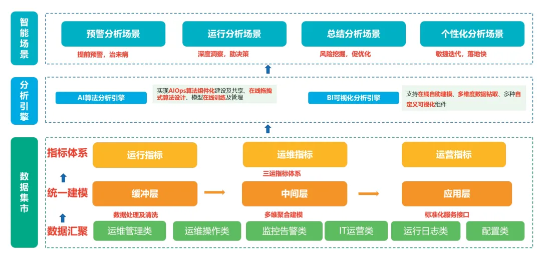 在个性化场景方面:通过AI、BI引擎提供自助式、定制式的个性化分析场景建设服务,快速响应个性化分析需求,必要时采取定制开发的形式进行交付,将数据赋能落在细处,促进整体运维能力提升。