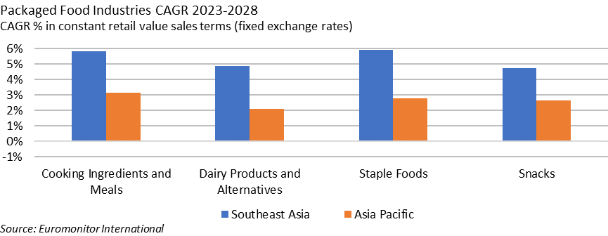 放眼未来,东南亚市场尤其是新兴市场,增长预期依然强劲。过去几年的新冠疫情推动了东南亚消费者从散装食品转向更卫生的包装食品,在越南、印度尼西亚、菲律宾等国,出现了大量新的食品品牌,市场竞争越发活跃,消费者开始习惯于更多选择,这对于食品制造商来说,意味着良好的机遇。在包装食品的四大品类——烹饪配料和预制餐、乳制品和替代品、主食、零食,东南亚市场的五年预期复合增长率都远远高于亚太整体水平,其中印度尼西亚有望以 6.7% 的复合增长率成为区域的增长领头羊。