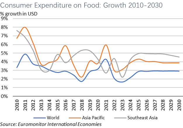 除了包装食品,东南亚的餐饮市场亦显示出强劲的增长潜力。在 2023 – 2028 年预测期,东南亚六大主要市场(菲律宾、印度尼西亚、马来西亚、新加坡、泰国和越南)的复合增长率高达 8.7%,高于亚太平均水平。