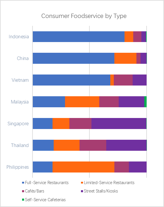 在餐饮业态方面,东南亚各国的业态也具有差异。印尼和越南的餐饮业态中,全服务餐厅的占比都非常高,与中国类似。而在菲律宾,最主流的业态是有限服务餐厅。(注:根据欧睿 Passport 定义,全服务餐厅是指提供桌边点餐等服务的餐厅,有限服务餐厅一般不提供桌边服务,例如快餐店等)