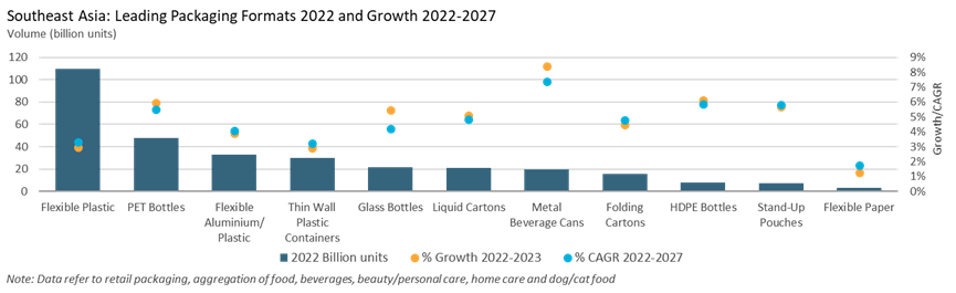 目前,在东南亚的消费品零售市场中,塑料占到总零售包装的 74%,其中包装食品主要使用柔性塑料,因为它成本较低且方便。除了柔性塑料外,PET 瓶也广泛用于饮料,因为它们便携且可回收利用,并且预计在 2022 年至 2027 年间以 5% 的年复合增长率增长,HDPE 瓶的复合增长率则更高。