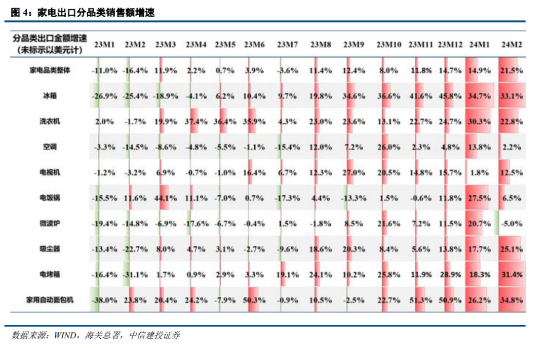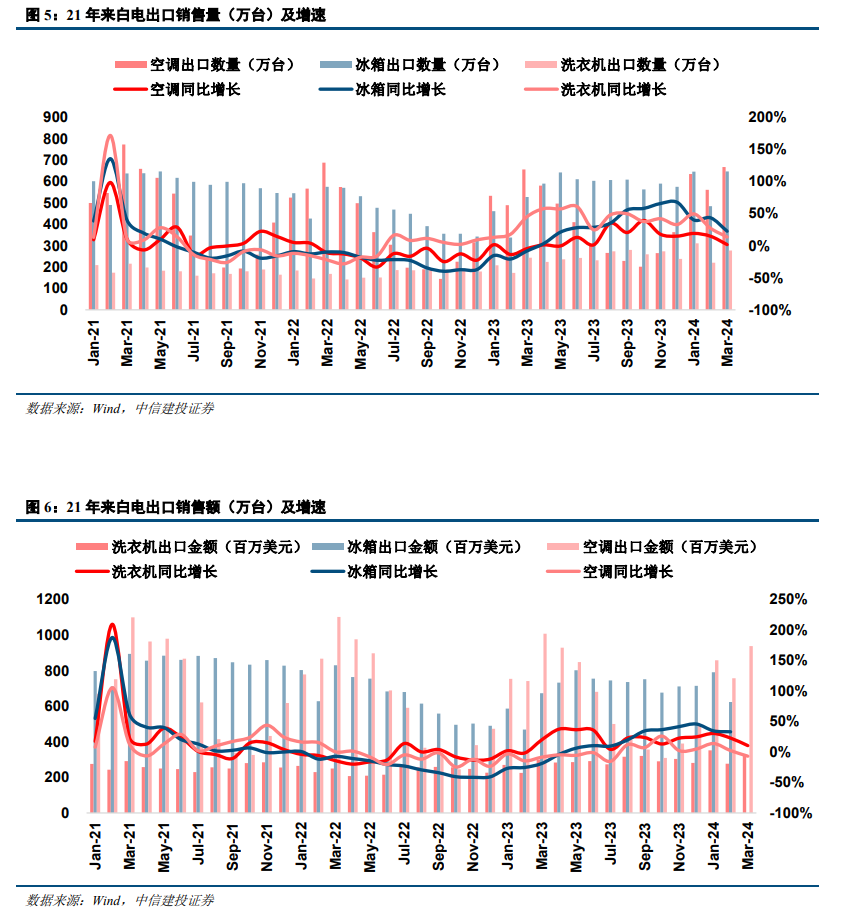 总体上与家电整体出口表现趋势一致,2023年上半年以来,白电板块逐渐恢复正增长,下半年增速进一步提升,冰洗空三大板块出口销售量均实现了双位数增长。具体而言,冰箱品类出口出口销售量为23年4月开始转正(出口销售额为23年5月);23年3月洗衣机品类出口销售额由负转正,此后出口销售额与销售量均维持较快增长;空调销售量增速从23年6月开始转正(销售额为8月)。24年延续积极表现,海关数据显示,24年1-2月空冰洗出口额同比增速分别为+11.5%/+38.3%/+31.0%。