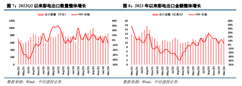 全球电视需求收缩,但中国出口规模增长。全球电视出货规模持续收缩,但随着中国大陆成为电视面板产业中心,全球显示产业重心逐渐内移,中国品牌和代工厂整体出货向好,规模呈现增势。根据海关总署数据,中国大陆彩电出口数量从2017年的8154万台增长至2023年的9966万台,2023年出口金额在面板价格上涨的推动下同比增长10%,DISCIEN数据显示中国大陆出口占全球海外市场电视总出货的比重由2022年的48%提升至2023年的52%。值得关注的是,随着全球经济增长放缓,局部冲突不断,中美竞争持续,海外建厂刮起了一轮新热潮,这些潜在因素的变动可能中断中国出口规模的增长趋势。