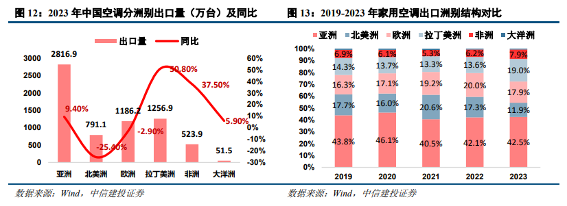 空调品类:亚洲、欧美市场为主,新兴国家快速起量。从份额占比上看,亚洲/北美洲/欧洲/拉美/非洲/大洋洲空调出口额占比分别为42.5%/11.9%/17.9%/19.0%/7.9%/0.8%。2023年欧美市场表现疲软,分别同比下降25.4%及2.9%;拉丁美洲、非洲增速较快,分别50.80%及37.5%。