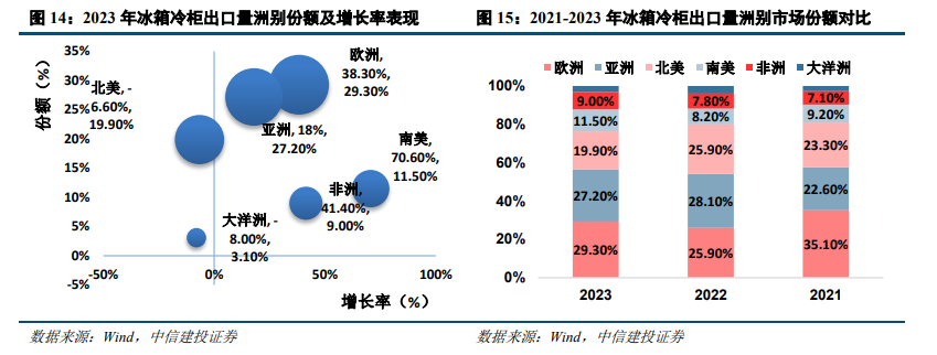 冰箱冷柜品类:欧、亚、美为前三大市场,分布相对均衡。2023年欧洲/亚洲/北美/南美/非洲/大洋洲出口额占比分别为29.3%/27.2%/19.9%/11.5%/9.0%/3.1%。北美、大洋洲出口走弱,分别同比下降8.00%和6.60%;其余各洲出口均维持增长,拉美增速高达70.6%,非洲和欧洲同比增速分别达到41.4%和38.3%。