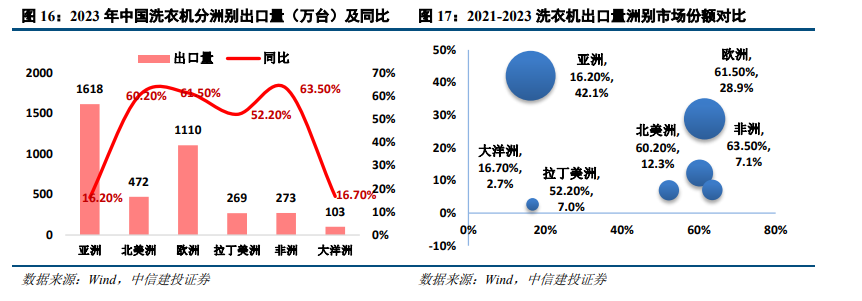 洗衣机品类:亚洲为第一大市场,欧美需求恢复。2023年亚洲/北美洲/欧洲/拉美/非洲/大洋洲出口额占比分别为42.1%/12.3%/28.9%/7.0%/7.1%/2.7%。除亚洲、大洋洲增长偏慢,其余各区域均有明显提升,欧美表现尤为突出,增速均超过60%。